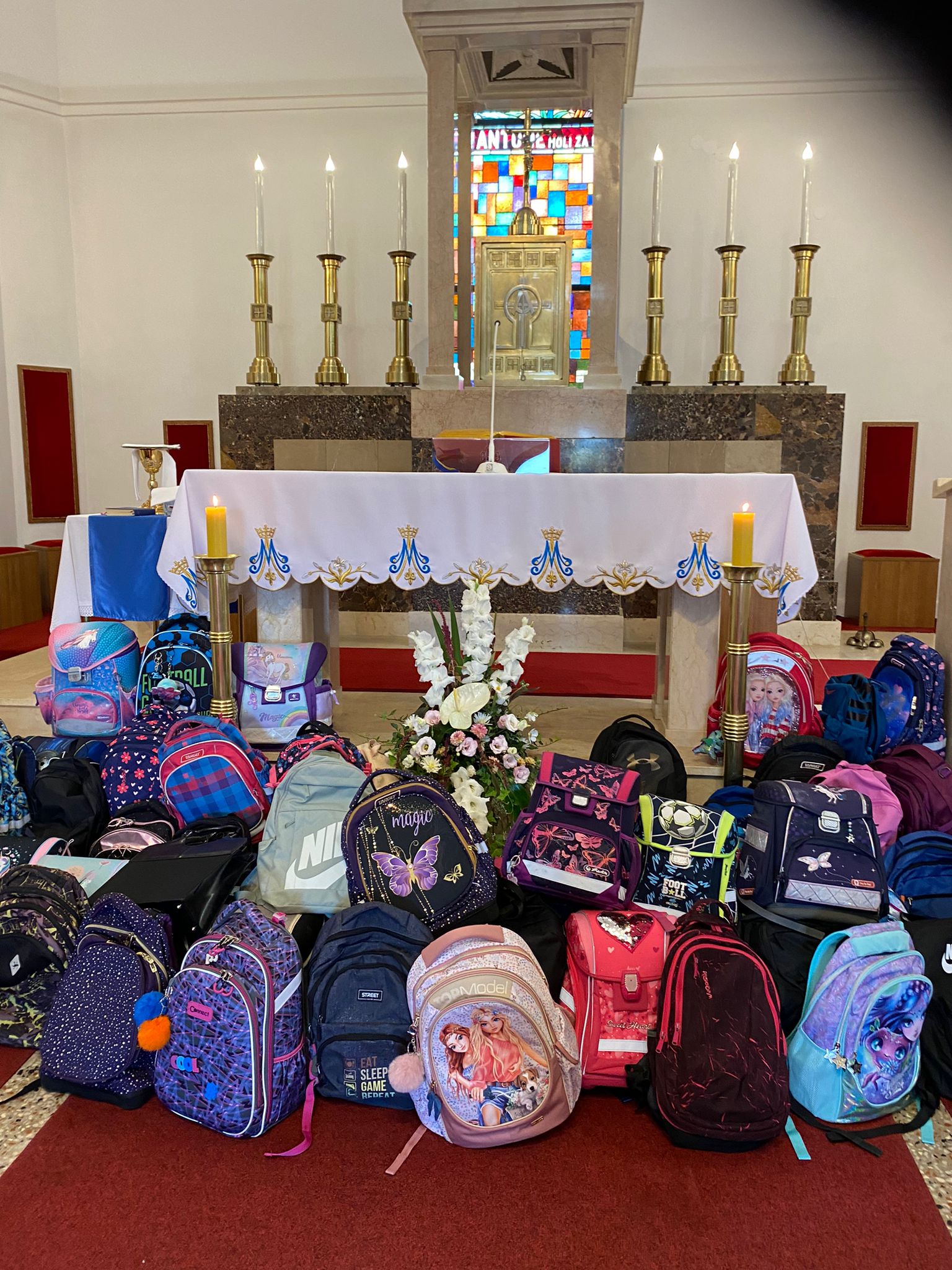 prisutnu djecu i njihove školske torbe koje su donijeli na blagoslov.